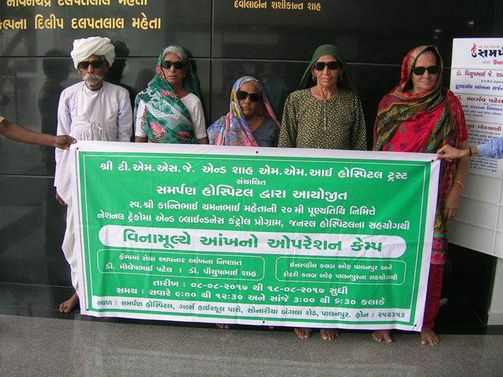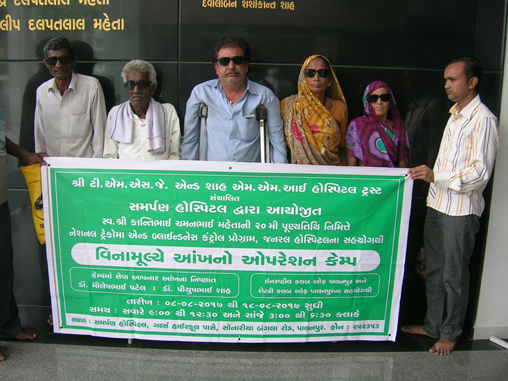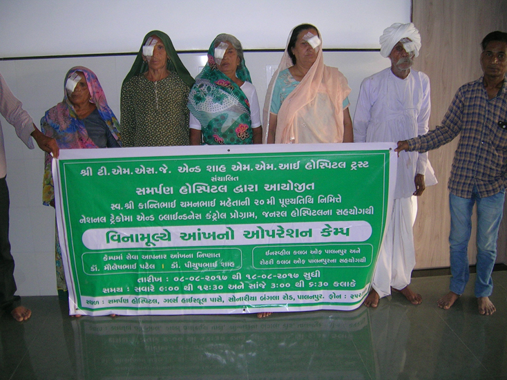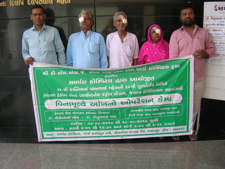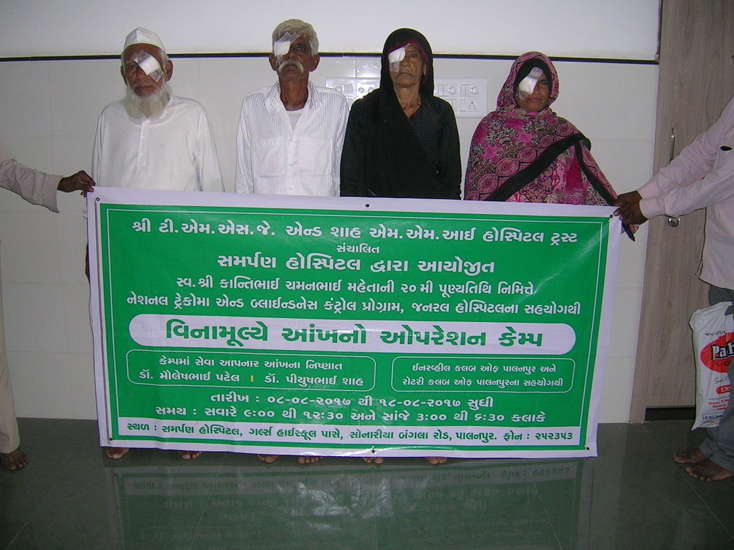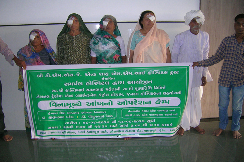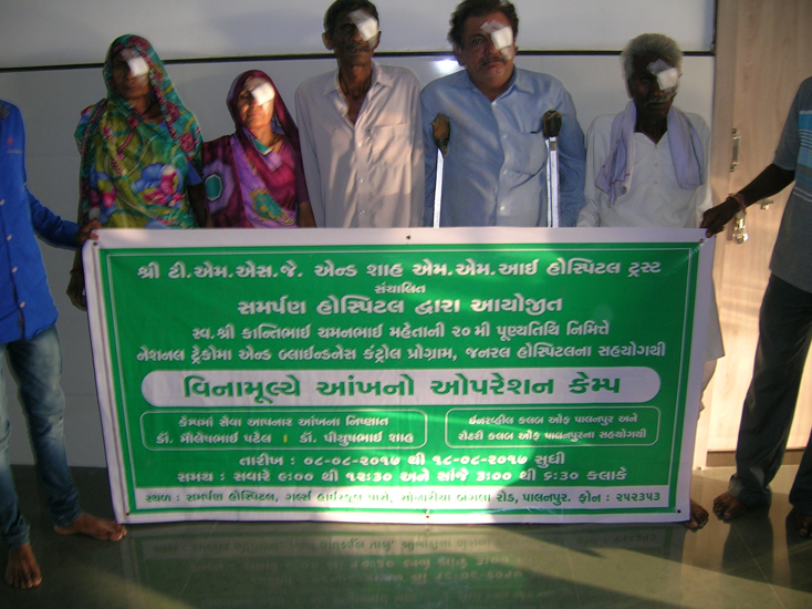 પરમ પૂજ્ય શ્રી કાનજીભાઈ ચીમનભાઈ મહેતા (ભાઈ) ની ૨૦મી પુણ્યતિથિ નિમિતે “આઈ હોસ્પિટલ”પાલનપુર ખાતે તા. ૮/૮/૨૦૧૭ થી ૧૮/૮/૨૦૧૭ સુધી નેશનલ ટ્રેકોમાં એન્ડ બ્લાઈંડનેશ કંટ્રોલ પ્રોગ્રામ, જનરલ હોસ્પિટલ પાલનપુર નાં સહયોગથી તથા રોટરી ક્લબ ઓફ પાલનપુર તેમજ ઇનરવ્હીલ ક્લબ ઓફ પાલનપુર ના સહયોગથી વિના મુલ્યે “આઈ કેમ્પ”નું આયોજન કરવામાં આવેલ છે જેમાં ૯૨૨ આંખના દર્દી ઓને તપાસ કરી તેમાંથી જરૂરીયાત વાળા ૫૮ દર્દીઓને નેત્રમણી મૂકી મોતિયાના ઓપરેશન કરી આપવામાં આવેલ હતા.