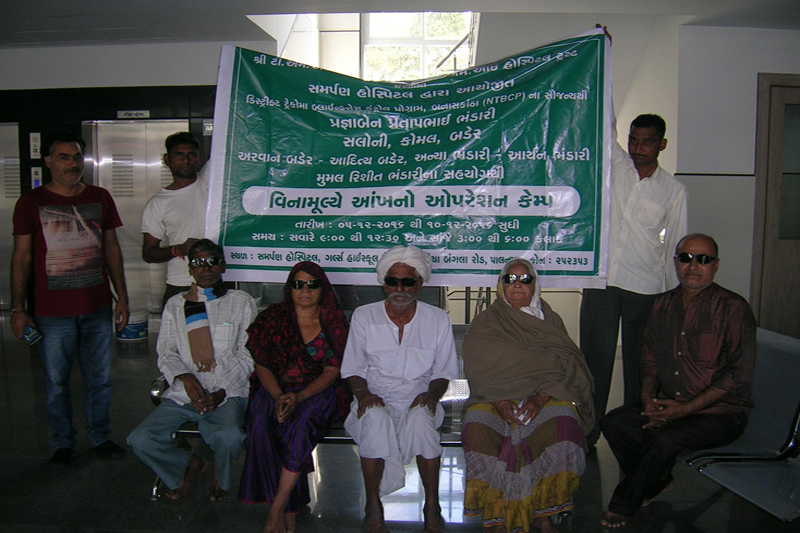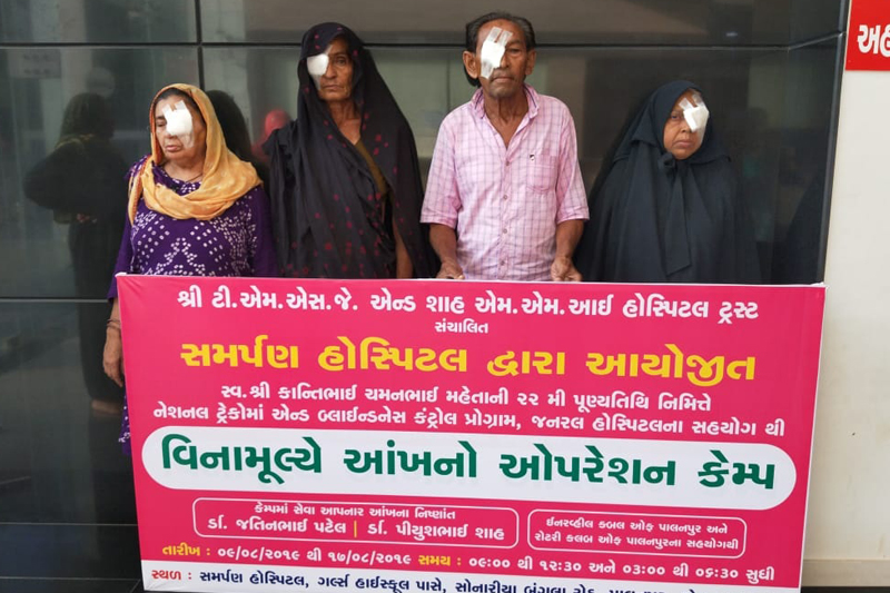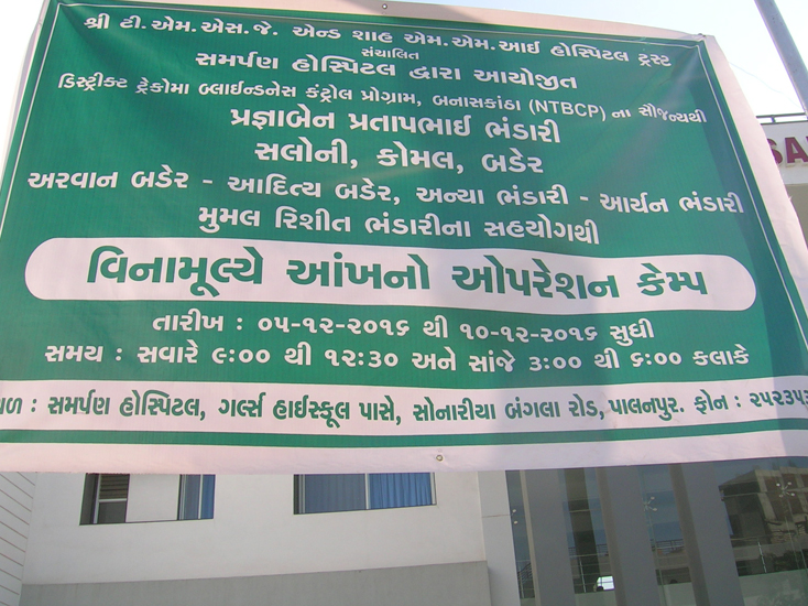 શ્રી ટી.એમ.એસ. જે. એન્ડ શાહ એમ. એમ. આઈ હોસ્પિટલ સંચાલિત સમર્પણ હોસ્પિટલ પાલનપુર દ્વારા આયોજિત ડીસ્ટ્રીકટ ટ્રેકોમાં એન્ડ બ્લાઈન્ડનેસ કંટ્રોલપ્રોગ્રામ, જનરલ હોસ્પિટલ તેમજ પ્રજ્ઞાબેન પ્રતાપભાઈ ભંડારી, સલોની કોમલ બડેર, આદિત્ય બડેર,મુમલ રિશીત ભંડારી, આર્યન ભંડારી પરિવાર દ્વારા આયોજિત “આઈ કેમ્પ” પાલનપુર આઈ હોસ્પિટલ દ્વારા તા. ૦૫/૧૨/૨૦૧૬ થીતા.૧૦/૧૨/૨૦૧૬ સુધી આયોજન કરવામાં આવેલ જેમાં ૪૩૬ દર્દીઓને તપાસવામાં આવેલ હતા. જેમાંથી ૩૫ જરૂરિયાતવાળા દર્દીઓને ‘આઈ હોસ્પિટલ ખાતેમોતિયાના ઓપરેશન નેત્રમણી બેસાડી કરી આપવામાં આવેલ હતા. આ કેમ્પમાં આઈ સર્જન ડો. પિયુષભાઈશાહ, ડો. મોલેષ જે. પટેલ દ્વારા સુંદર સેવાઓ આપવામાં આવેલ. તથા આ કેમ્પને સફળબનાવવા આઈ હોસ્પિટલ આ સ્ટાફ ના સ્ભયોએ પણ સુંદર સહકાર આપેલ.
