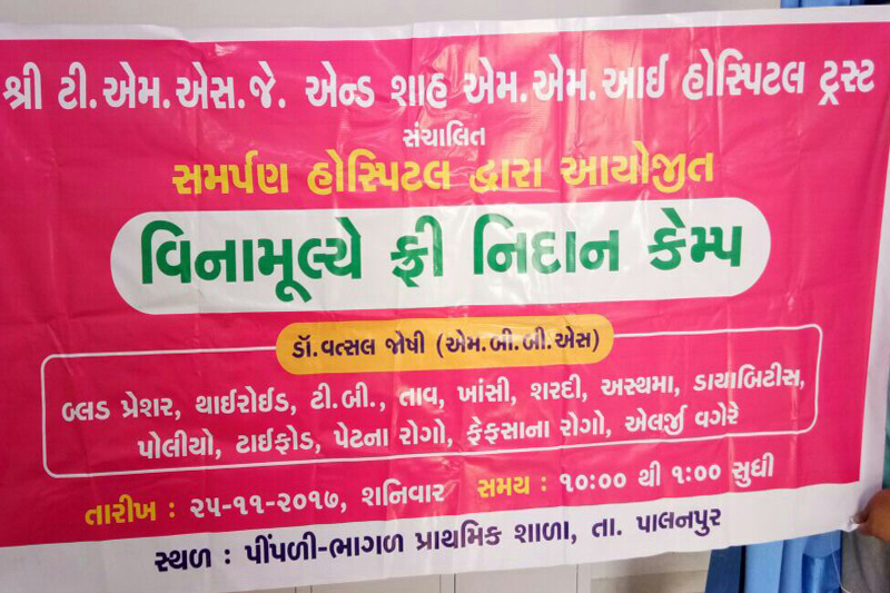 ટી.એમ.એસ. જે એન્ડ શાહ એમ. એમ. ટ્રસ્ટ દ્વારા સંચાલિત “સમર્પણ” હોસ્પિટલ દ્વારા તા. ૨૫-૧૧-૨૦૧૭ ને શનિવાર ના રોજ “પીપળી ભાગળ” ગામ ખાતે વિનામુલ્યે તપાસ કેમ્પનું આયોજન કરવામાં આવેલ જેમાં ભાગળ તેમજ આજુબાજુના વિસ્તારના ૯૦ દર્દીઓને તપાસી અને વિનામૂલ્યે દવાઓ આપવામાં આવેલ . કેમ્પમાં હોસ્પિટલ ના ડૉ. વત્સલ જોષી એ તથા અન્ય સ્ટાફ એ સેવાઓ આપેલી હતી.